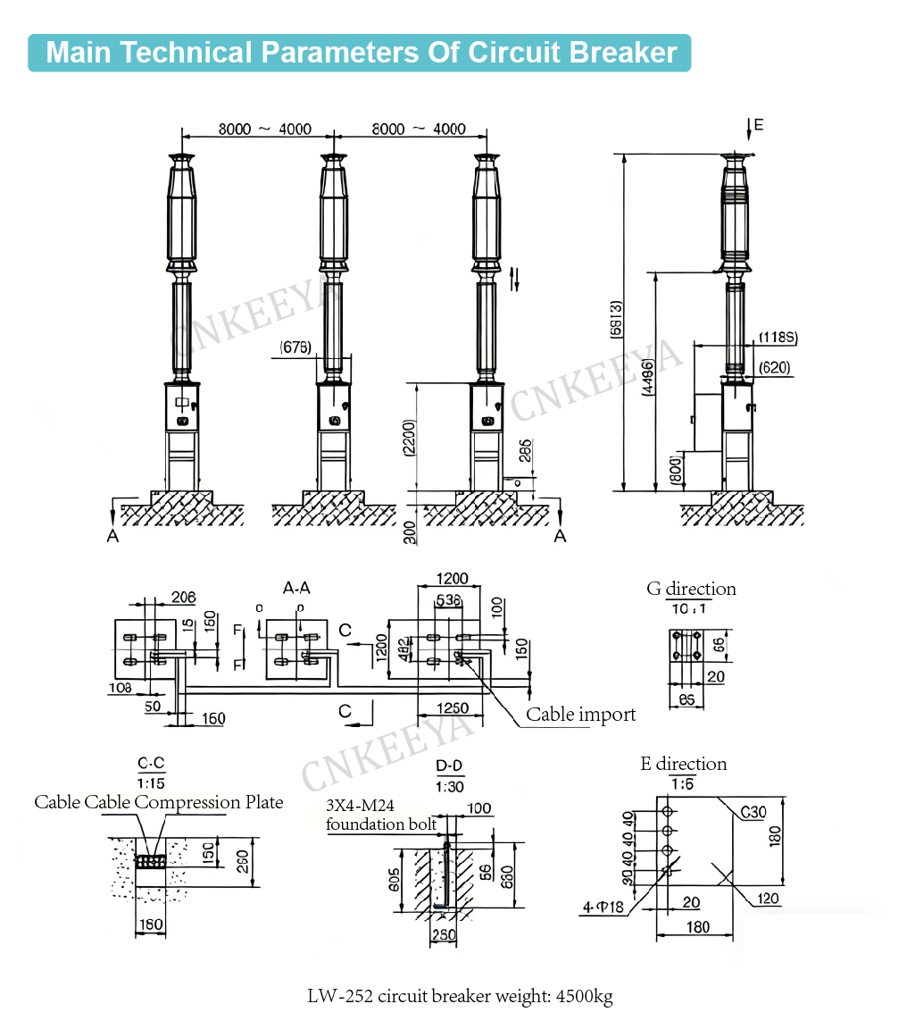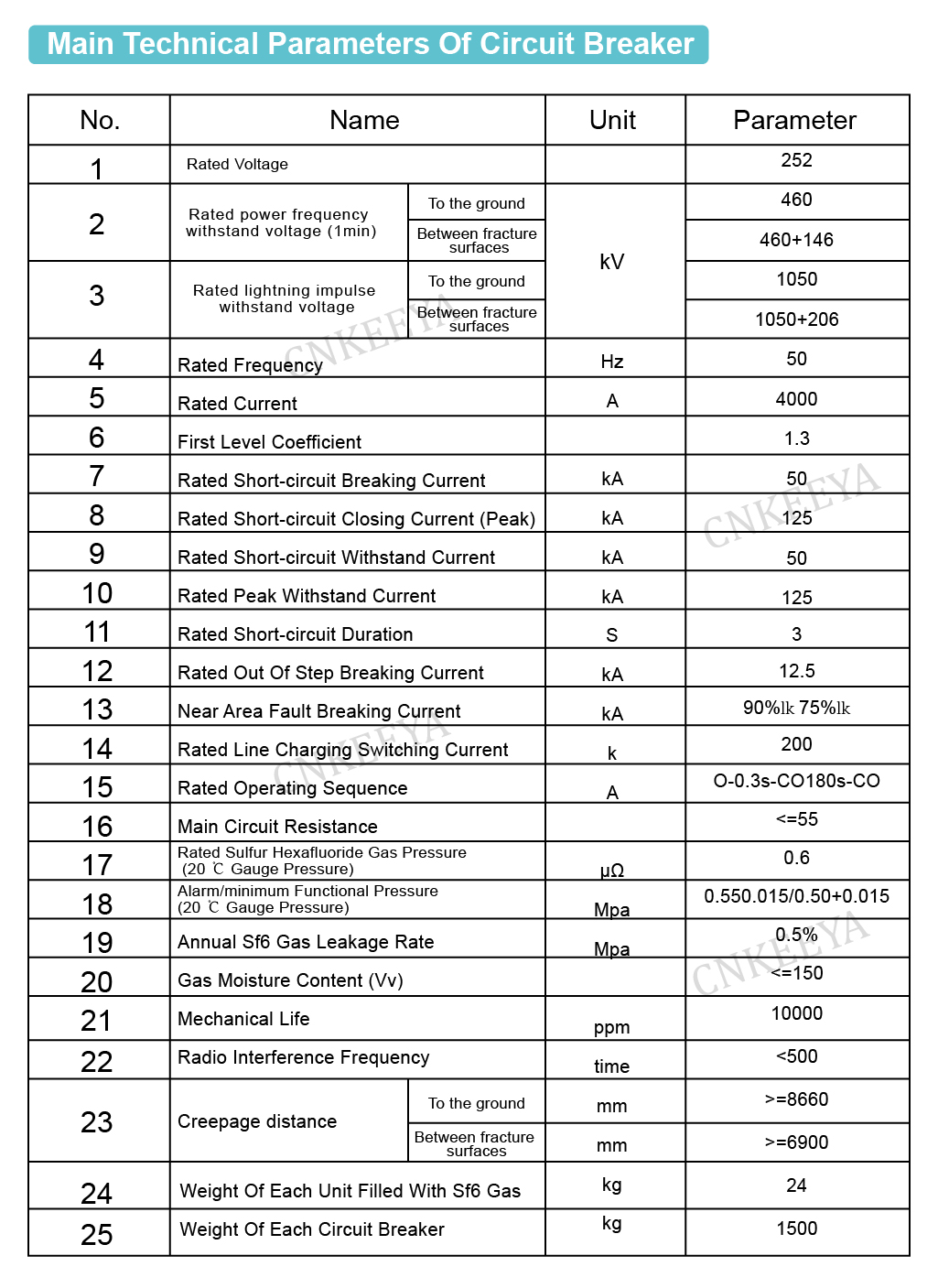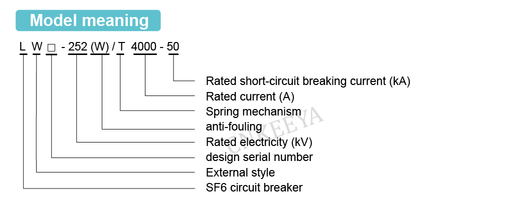 CNKEEYA,LW□-252 Udendørs High-Voltage AC Svovl Hexafluoride (SF₆) Circuit Breaker er et udendørs produkt, der kan anvendes til 50Hz vekselstrømsnet med en maksimal spænding på 252kV i områder med højde ≤2000m, omgivelsestemperatur ≥-30 IV. Det bruges hovedsageligt til at afbryde mærke- og fejlstrømme, skifte kredsløbslinjer og fungere som en sammenkoblingsafbryder, der realiserer effektiv kontrol og beskyttelse af strømsystemer.