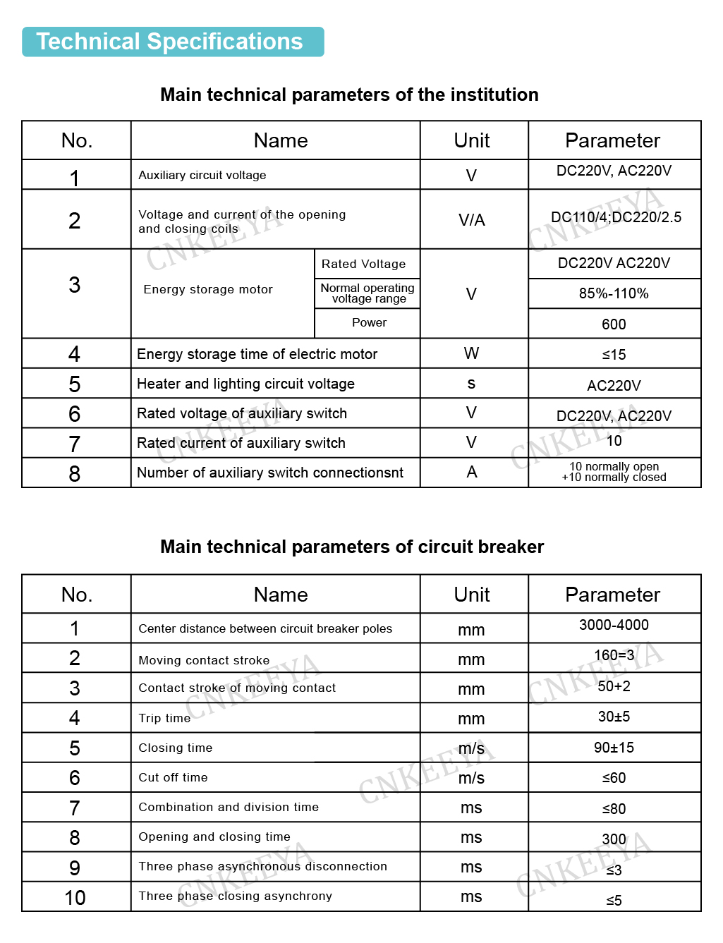 Nominelle elektriske parametre for styrekredsløbet (mærkespænding af energilagringsmotoren, nominel spænding af åbnings- og lukkespoler); Navne og mængder af nødvendige reservedele, specialudstyr og værktøj (bestilles separat); Ledningsretningen af terminalen på én gang.